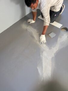 補修が完了したら、床全面に**下塗り(プライマー)**を塗布します。