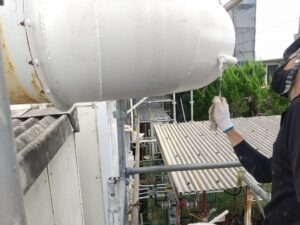 細部や溶接部も見逃さず、刷毛とローラーを使い分けて丁寧に塗装。