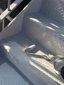 今回は、立体駐車場の外壁タイル改修工事に合わせて、鉄骨階段の塗装工事を行いました。