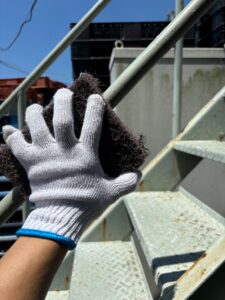 踏板の裏側や手すりの接合部など、サビが出やすい部分も丁寧に処理しています。